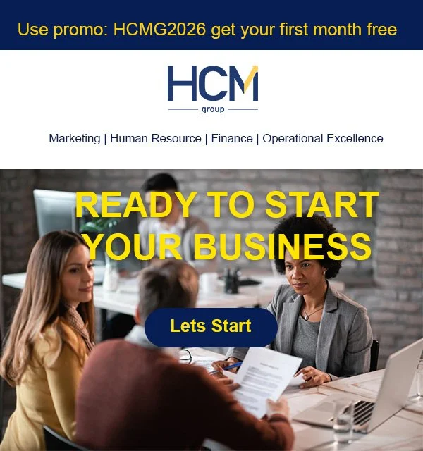 An example campaign targeting new subscribers includes the subject line “Ready to Start a Business?” The email introduces HCMG’s services and provides a clear call-to-action, encouraging recipients to explore offerings through a prominently placed “Let’s Start” button alongside imagery focused on supporting small businesses.